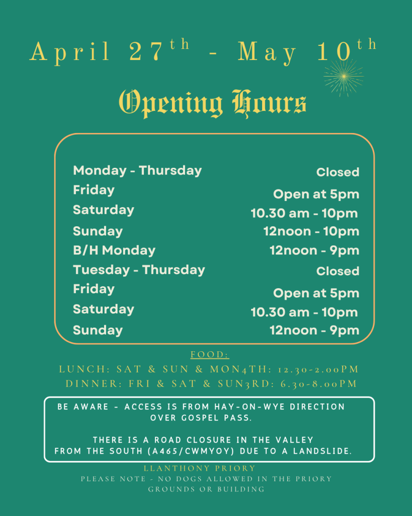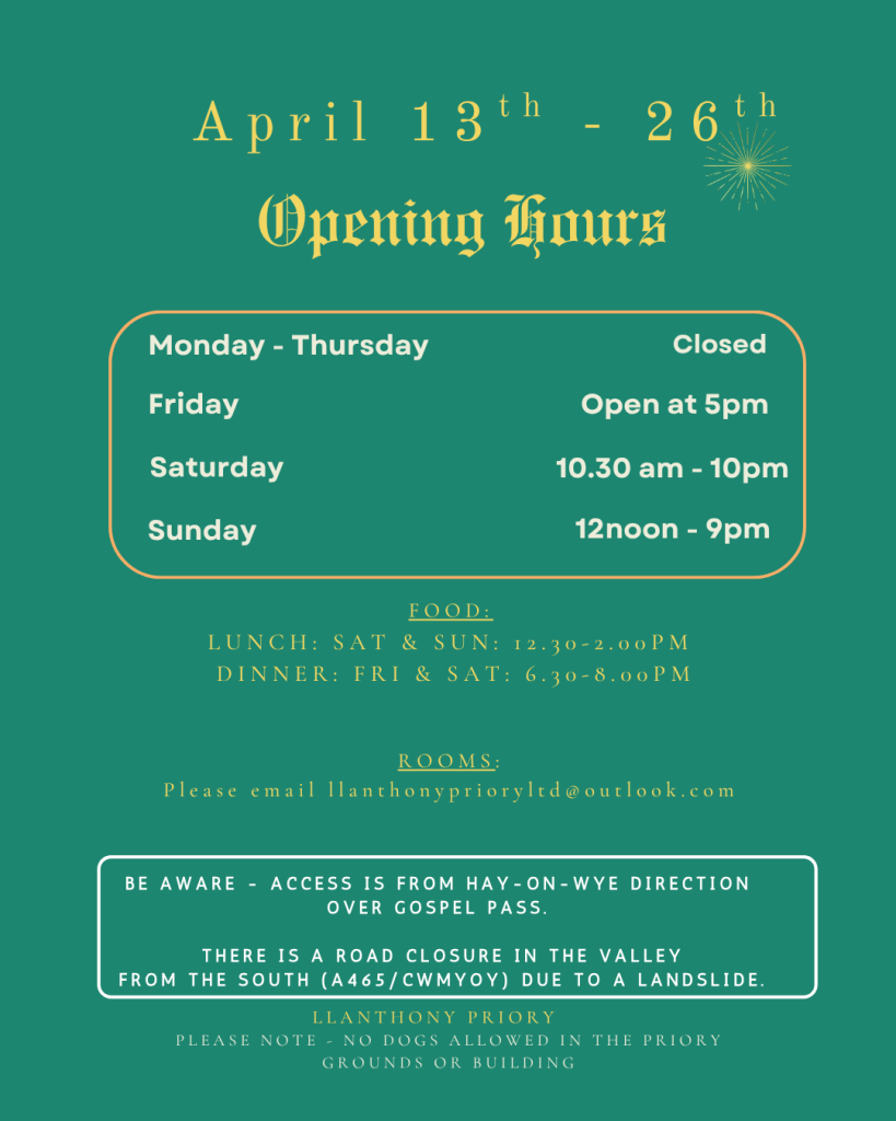 Prices for the rooms are available on enquiry to our email Llanthonyprioryltd@outlook.com
